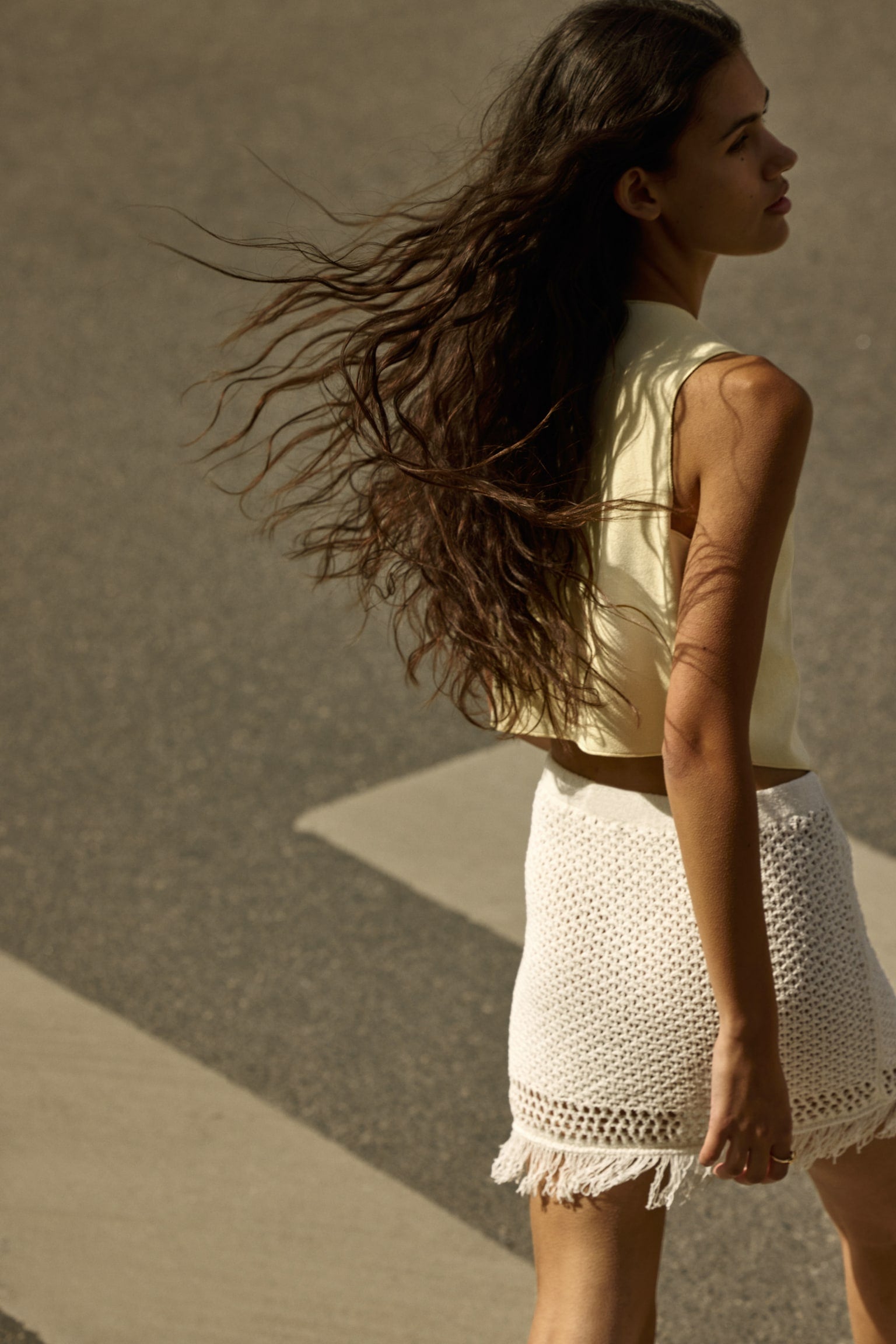 Chaleco corto y ajustado de jersey suave. Cuello redondo y botones metálicos en la parte delantera.