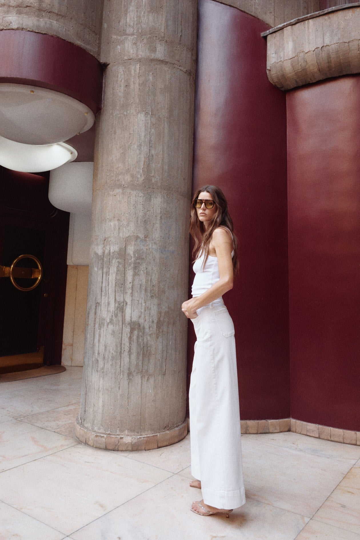 Vaquero en denim de algodón con ligero stretch para una comodidad óptima. Pernera amplia con corte ajustado de cintura a cadera y corte holgado de muslo a bajo. Cintura de talle alto con cierre de cremallera y botón. Bolsillos de parche delante y detrás. Largo estándar con bajo apenas apilado. Una declaración de moda en clave denim que nunca falla.