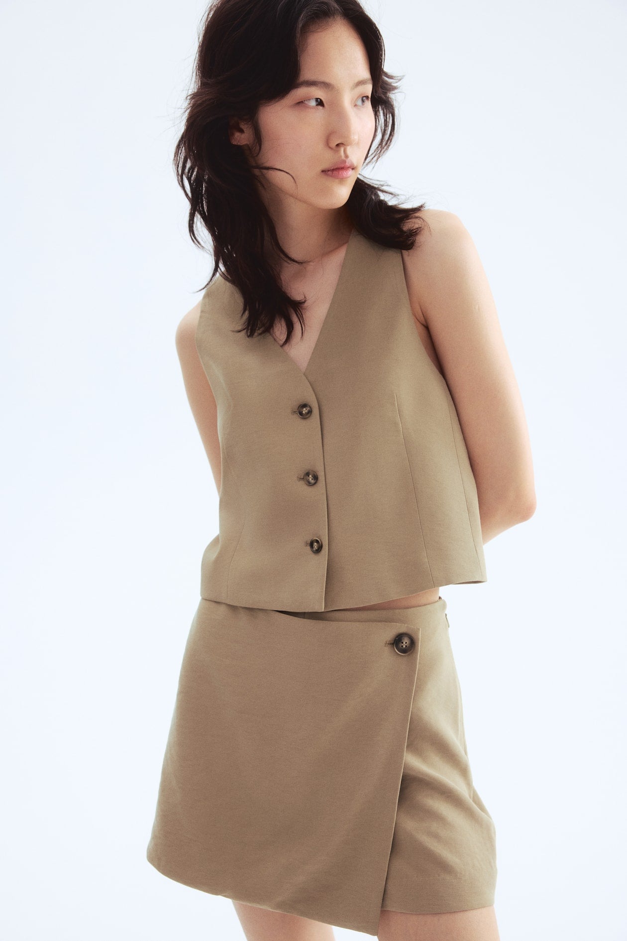 Minifalda pantalón en mezcla de viscosa. Modelo cruzado con botón delante y cremallera oculta con cierre de corchete en un lateral.